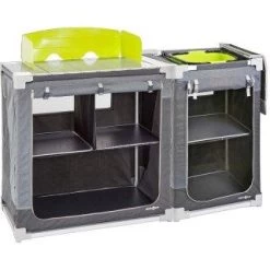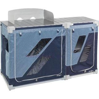 1) Waschbox mit teilbarer Innenablage und Bodenöffnung, um je nach Bedarf eine Gasflasche oder einen Mülleimer unterbringen zu können. Die abnehmbare Arbeitsplatte besteht aus wetterfestem Aluminium und dient auch als Abdeckung für das integrierte Waschbecken.