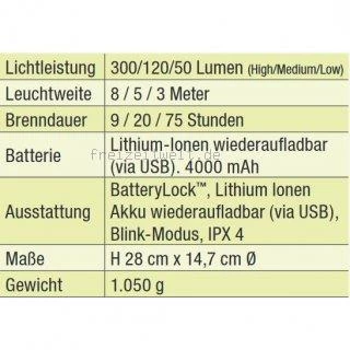 Leicht und bequem per USB Anschluss aufgeladen, versorgt die Laterne Sie mit hellen 300 Lumen auch im tiefsten Dunkel zuverlässig mit Licht.