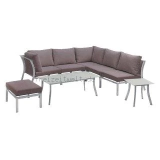 | Ausführungen und Zubehör | Edelstahl Loungegruppe Sessel weiß 68 x 86 x 72 cm, Edelstahl Loungegruppe Sessel taupe 68 x 86 x 72 cm, Edelstahl Loungegruppe Eckteil weiß 86,5 x 86,5 x 71,5 cm, Edelstahl Loungegruppe Eckteil taupe 86,5 x 86,5 x 71,5 cm, Edelstahl Loungegruppe Hocker 68 x 50 x 31 cm, Edelstahl Loungegruppe Tisch taupe rechteckig 120 x 60 x 45 cm, Edelstahl Loungegruppe Tisch weiß quadratisch 45 x 45 x 45 cm, Edelstahl Loungegruppe Tisch taupe quadratisch 45 x 45 x 45 cm |