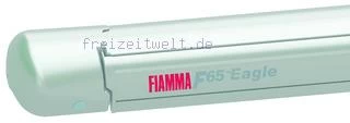 Markise F65 Eagle, die erste freitragende mit einem 12 V Motor ausgestattete Markise von Fiamma. Sie ist weiter ausgerüstet mit ei- nem neuen „Double Block System“. welches die Regulierung des Neigungswinkels von 5-17° ermöglicht und so die selbsttragenden Gelenk arme unterstützt, sodass keine Stützfüße erforderlich sind.