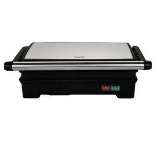 Freizeitwelt Kontaktgrill, kann sowohl als Sandwichmaker dienen und von oben und unten heizen, als auch komplett geöffnet als große Grillplatte verwendet werden. Die Grillplatten sind Teflon-beschichtet und er besitzt ein integriertes Fett-Abtropf-System. Er läuft mit 220/240 V mit einer Leistung von 750 Watt, Maße: 24 x 27 x 9 cm.