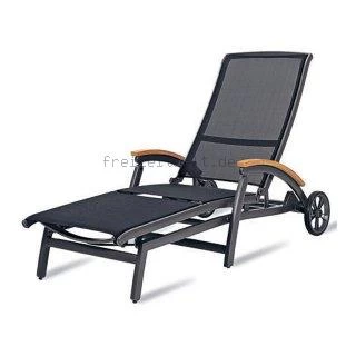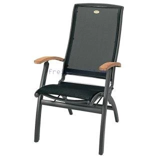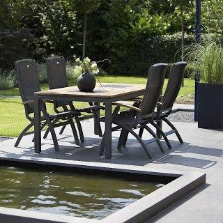 Wunderschöne Designergruppe aus mehrfach lackiertem Aluminium mit abgerundeten Teakholzarmlehnen und wetterfesten Textilenbezügen.
