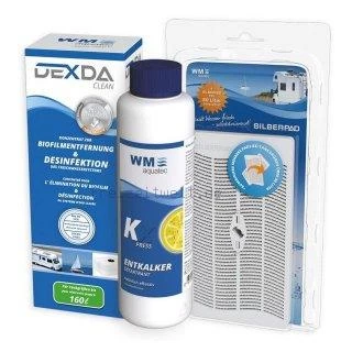 Das Hygiene-Set ist ein Komplett-Set für die ganze Saison. Es enthält, je nach Ausführung, 250 ml Desinfektionsrei- niger DEXDA® Clean und 250 ml KXPRESS Entkalker, sowie 1 bzw. 2 Silberpads zur Konservierung von 17500 bzw. 35000 Liter Wasser.